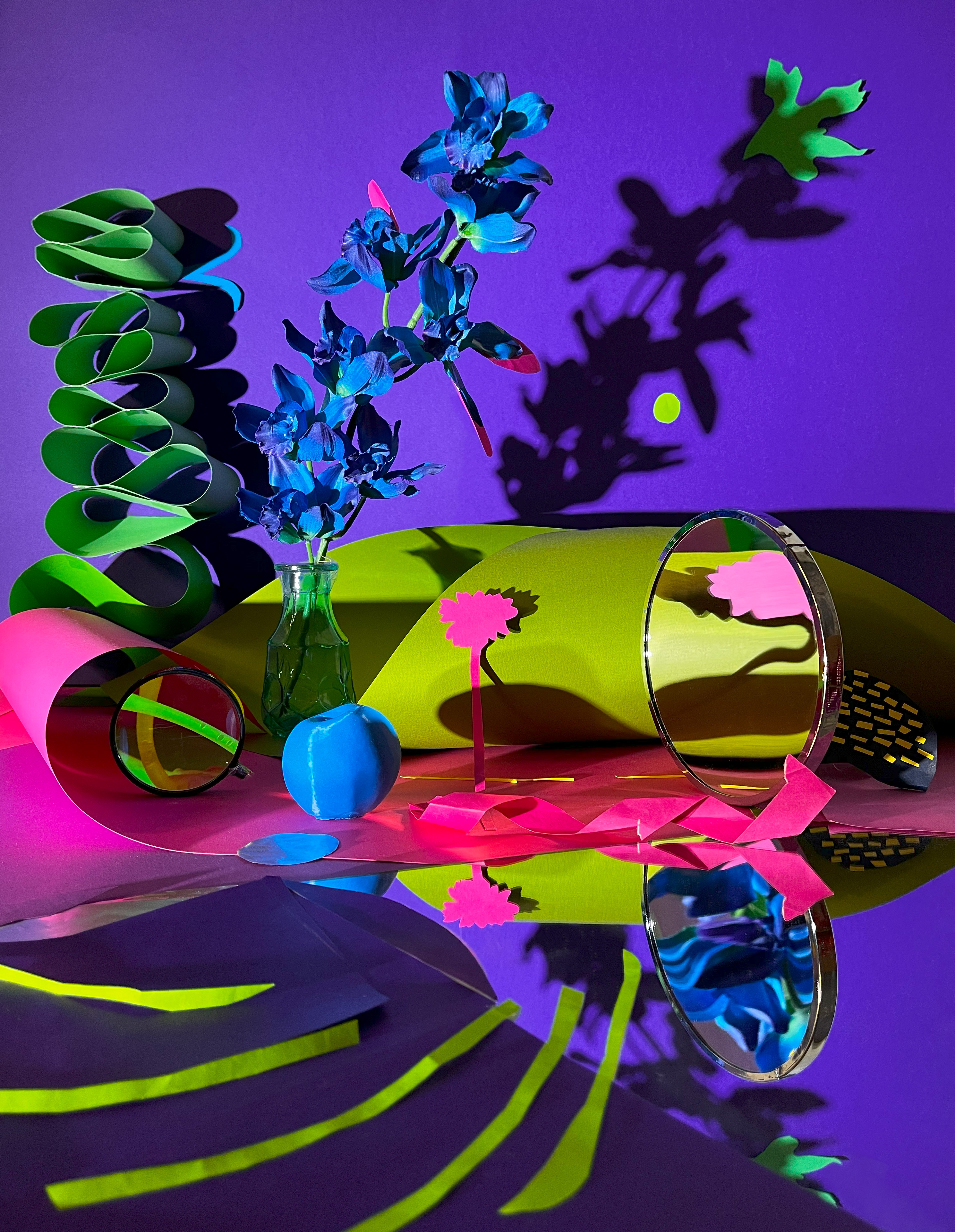 The compositions that I create are made manually. They are physical and architectural. I do not use digital tools to create a shape and manipulate the photos. Each scene is composed of still-life objects and paper with various colors, light sources, and shadows. All elements converge to create playful scenes that challenge human perception of reality.
